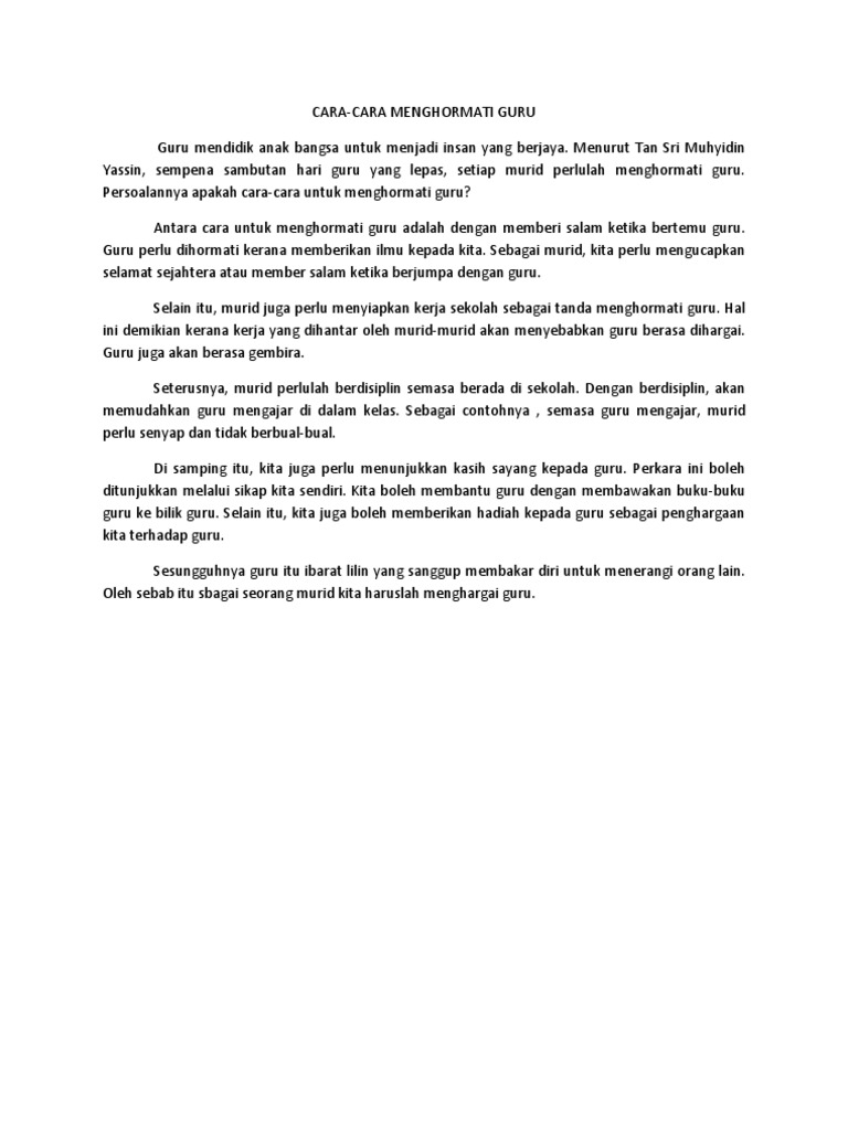 Karangan Keperihalan Cara Menghormati Guru Pdf. Sejak dua dan tiga dekad kebelakangan ini memang kita dapat menyaksikan bahawa adab menghormati guru di sekolah semakin dilupakan. Tajuk syarahan saya pada pagi ini ialah Menghormati guru amalan mulia.